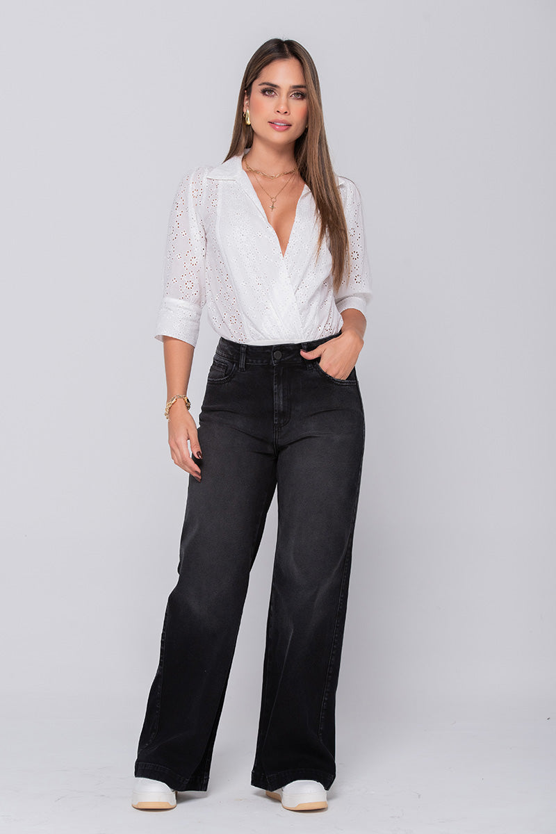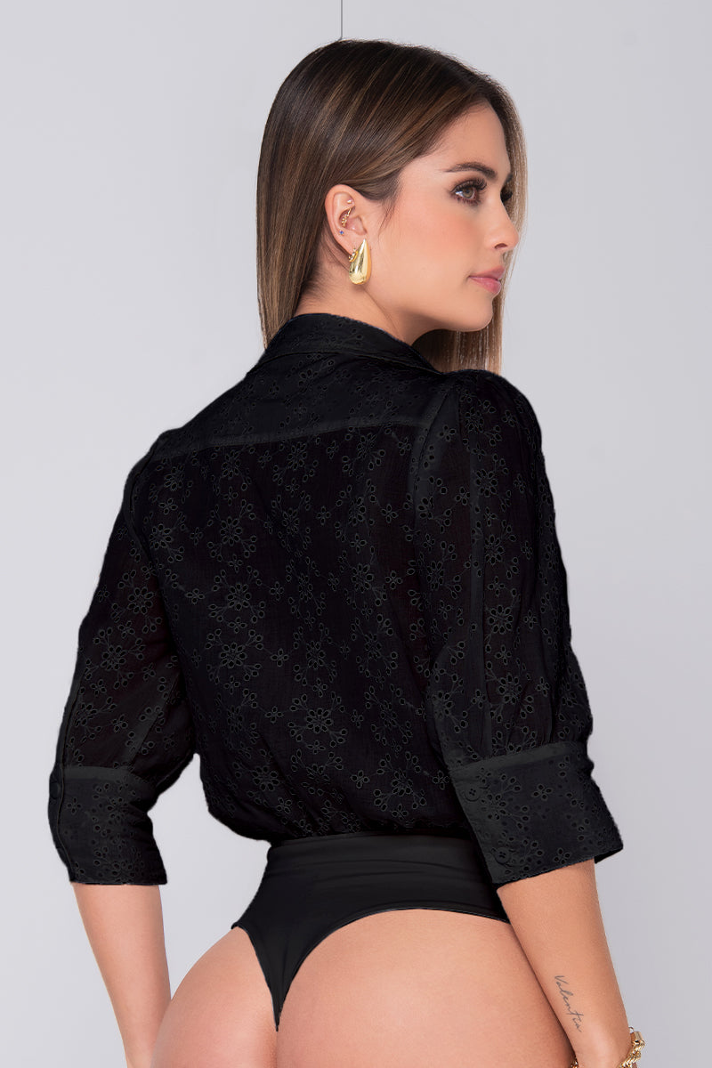 Body Manga 3/4 en Ojalillo, Cuello clásico con Escote profundo, Silueta ajustada sin elongación. Disponible en color Ivory, Rosa y Negro.