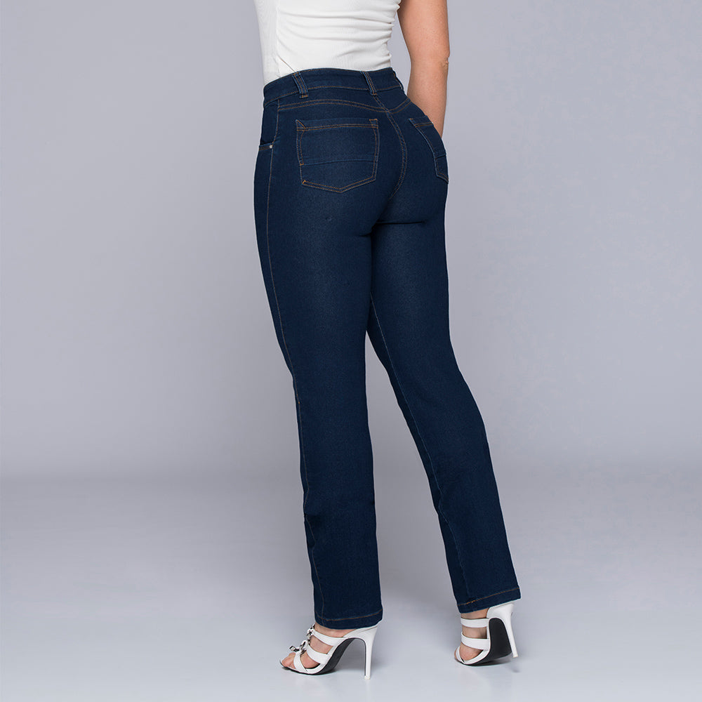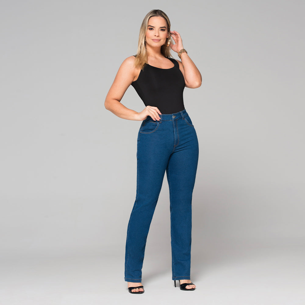 Jean Clásico Bota Recta Tiro Alto, 5 Bolsillos Funcionales. Silueta Ajustada con elongación. Disponible en color Azul, Oscuro, Azul Medio y Azul Claro.