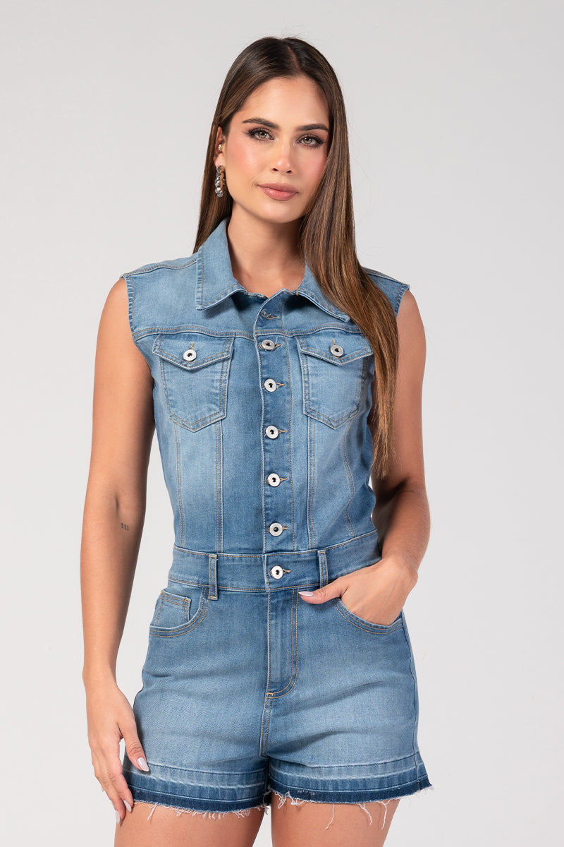 Enterizo Corto, Manga Sisa, Ruedo Suelto. Cuello clásico con botonadura Frontal, Bolsillos frontales y posteriores funcionales. Silueta Semi ajustada con elongación. Disponible en color Azul Medio.